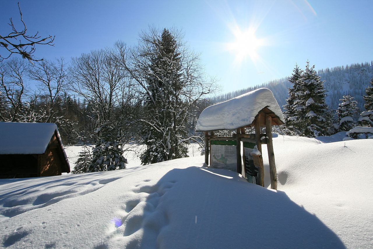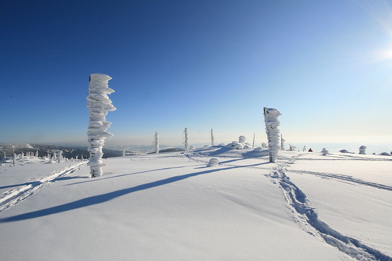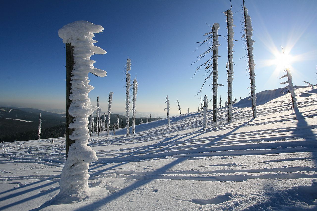 Pohled ze zamrzlého lipenského jezera od Hůrky na Smrčinu (HLV 43; 1332 m), Hraničník (HLV 68; 1282 m), Studničnou (HLV 142; 1160 m) a Plechý (HLV 21; 1378 m). Zvláště při sněhové pokrývce vynikne úplné odlesnění Plechého.