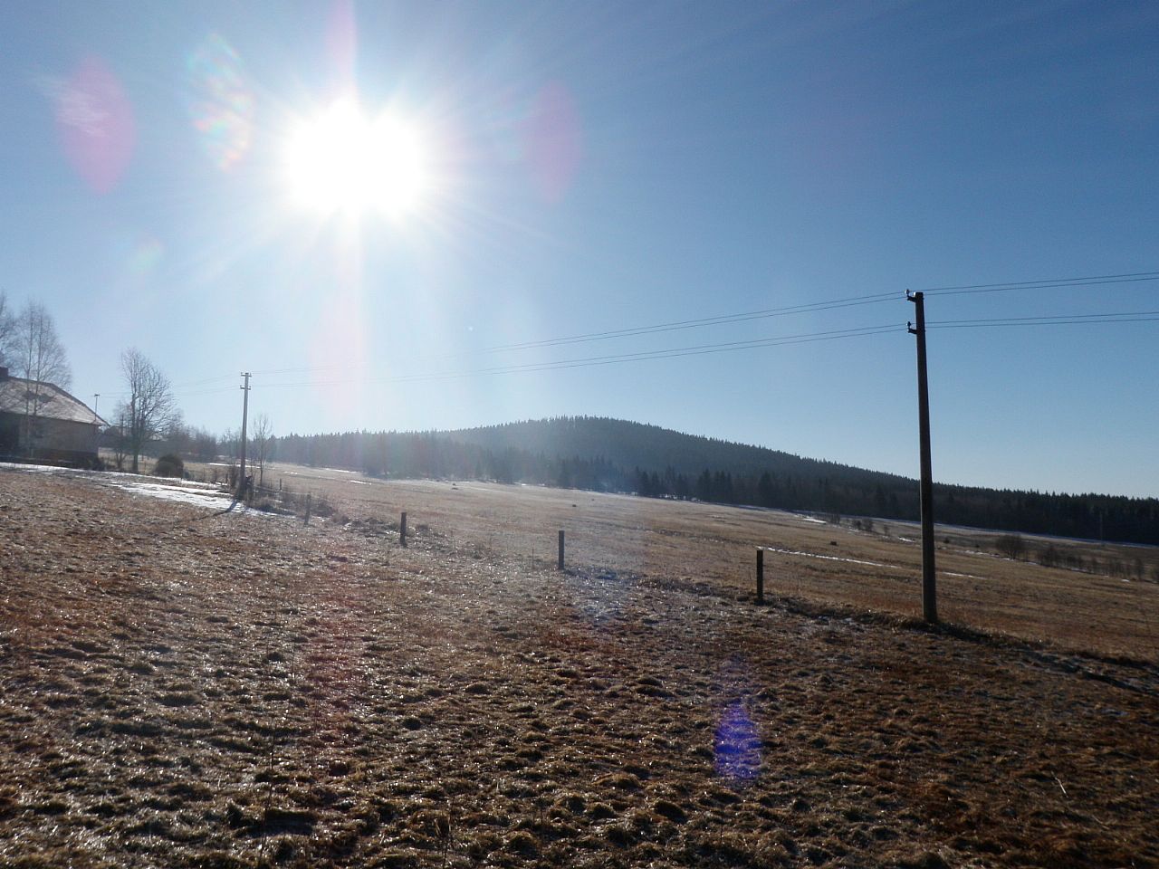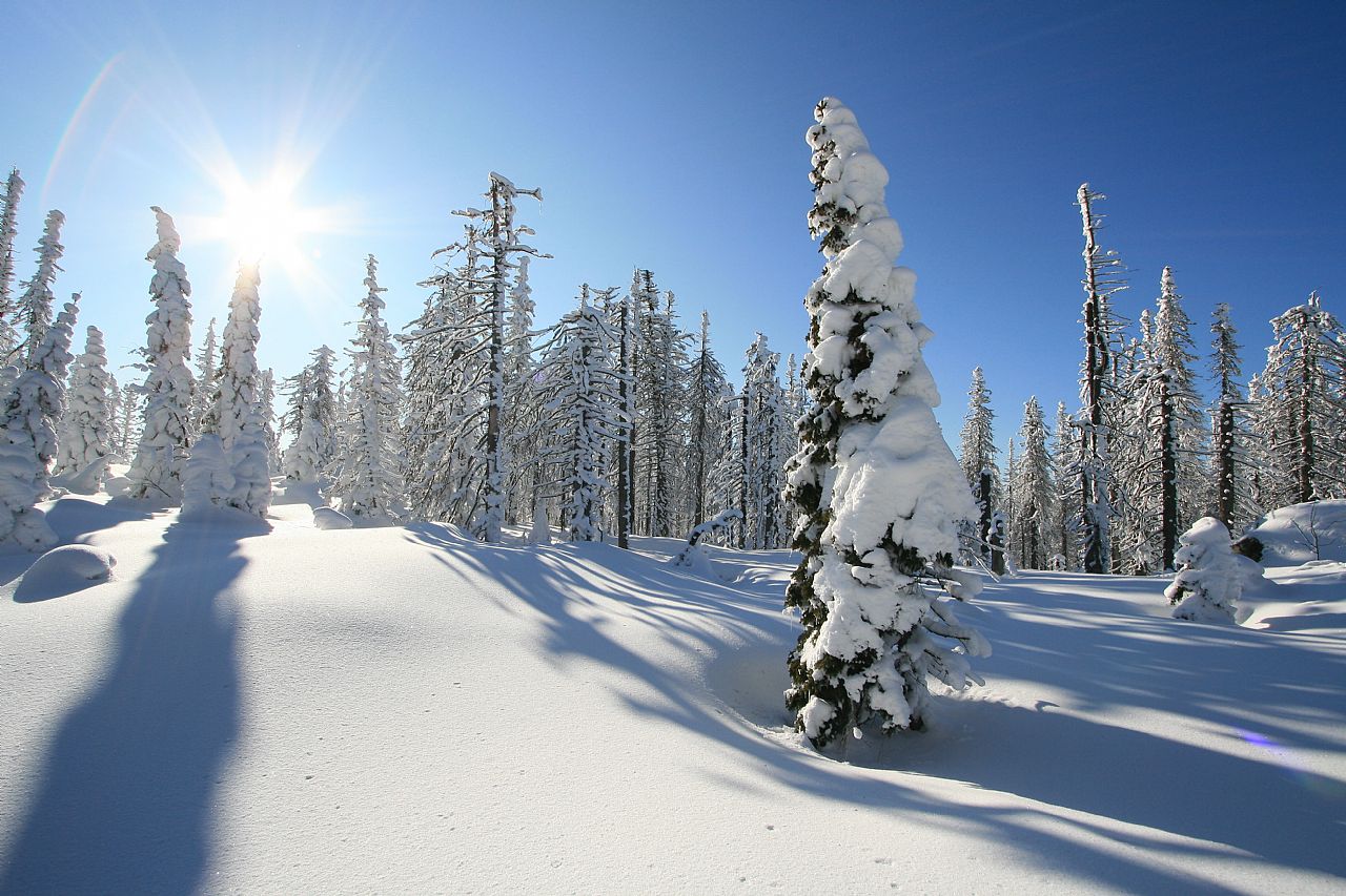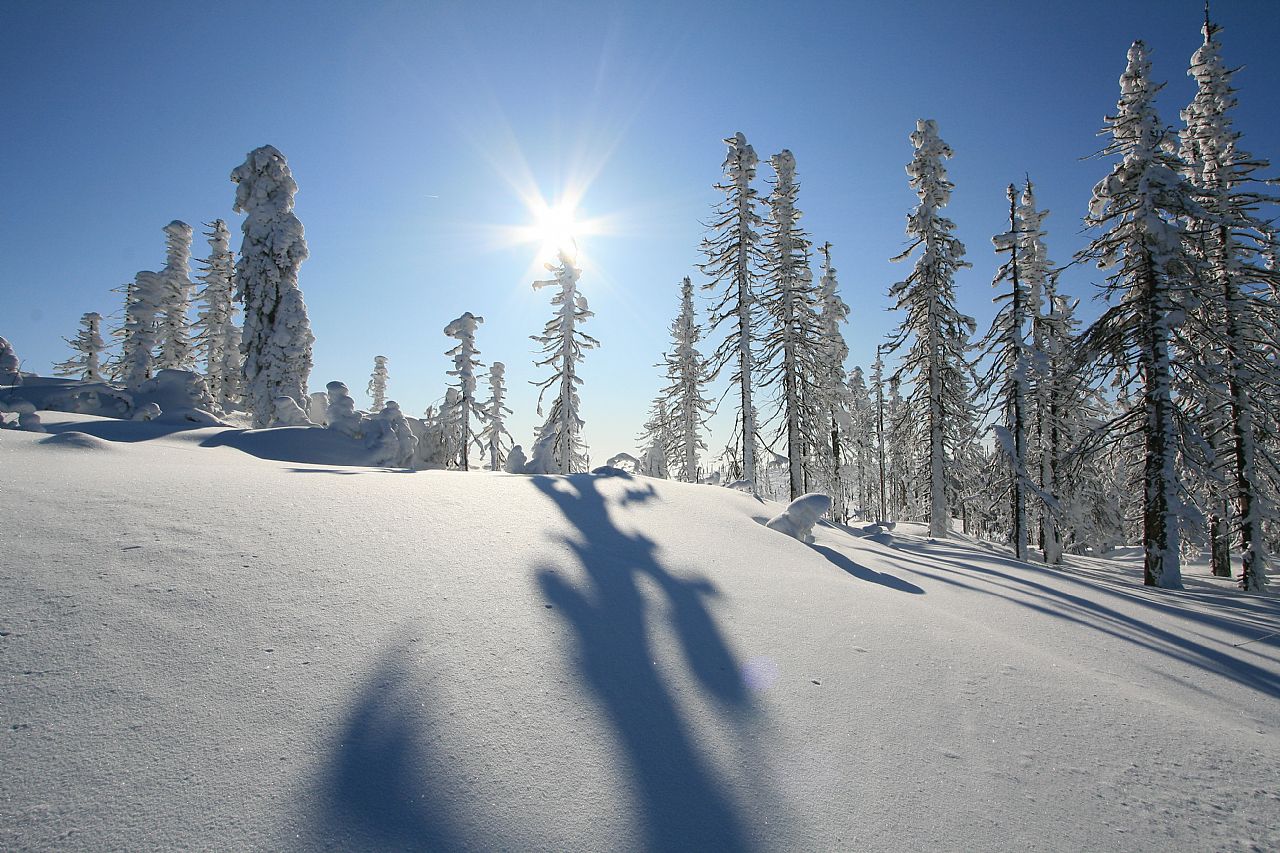 Pohled ze zamrzlého lipenského jezera od Hůrky na Smrčinu (HLV 43; 1332 m), Hraničník (HLV 68; 1282 m), Studničnou (HLV 142; 1160 m) a Plechý (HLV 21; 1378 m). Zvláště při sněhové pokrývce vynikne úplné odlesnění Plechého.