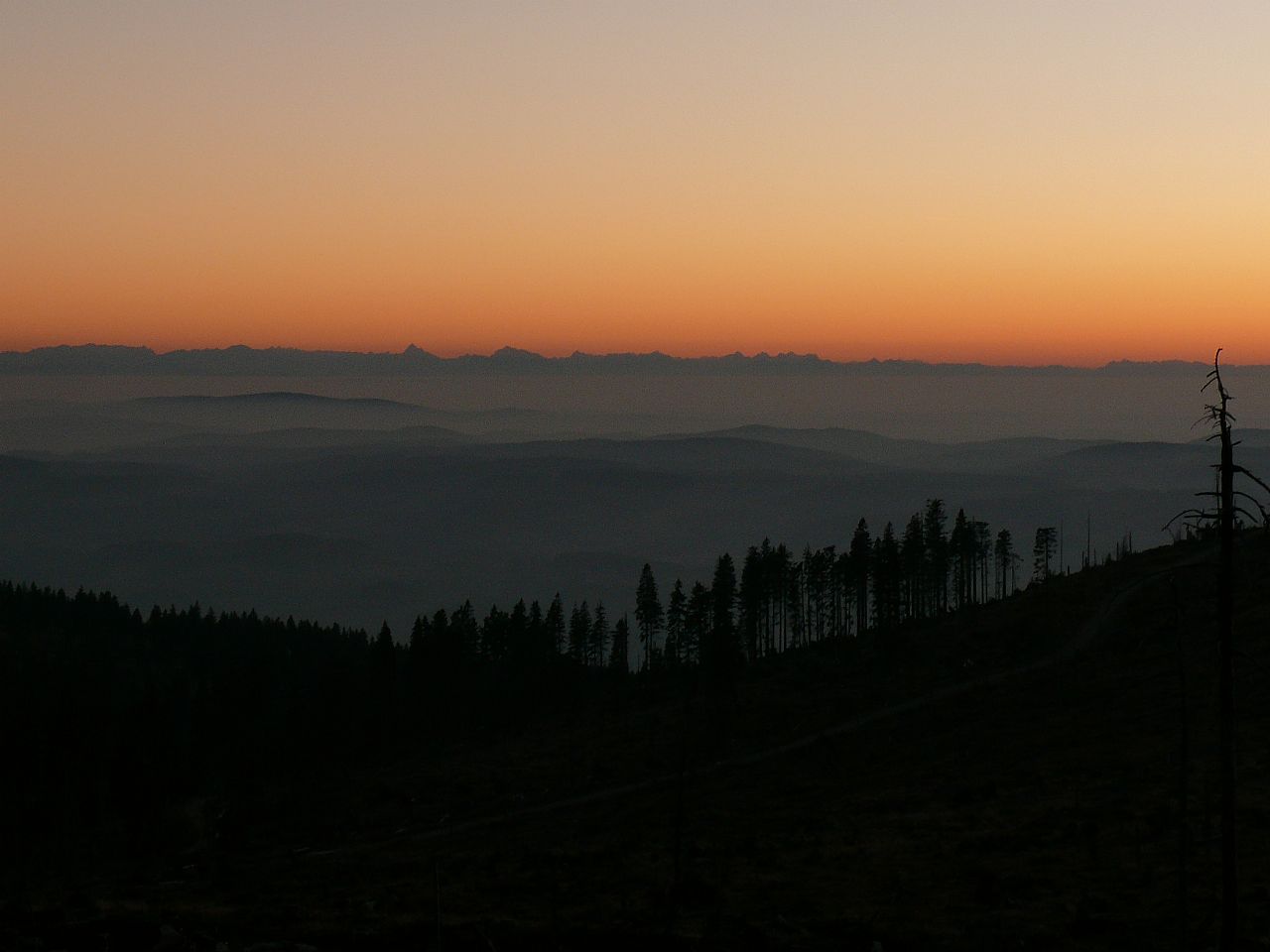 Západ slunce na vrcholu Plechého (HLV 21; 1378 m) a pohled na jih na Alpy.