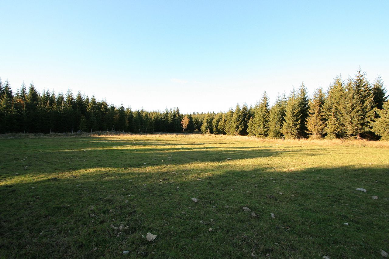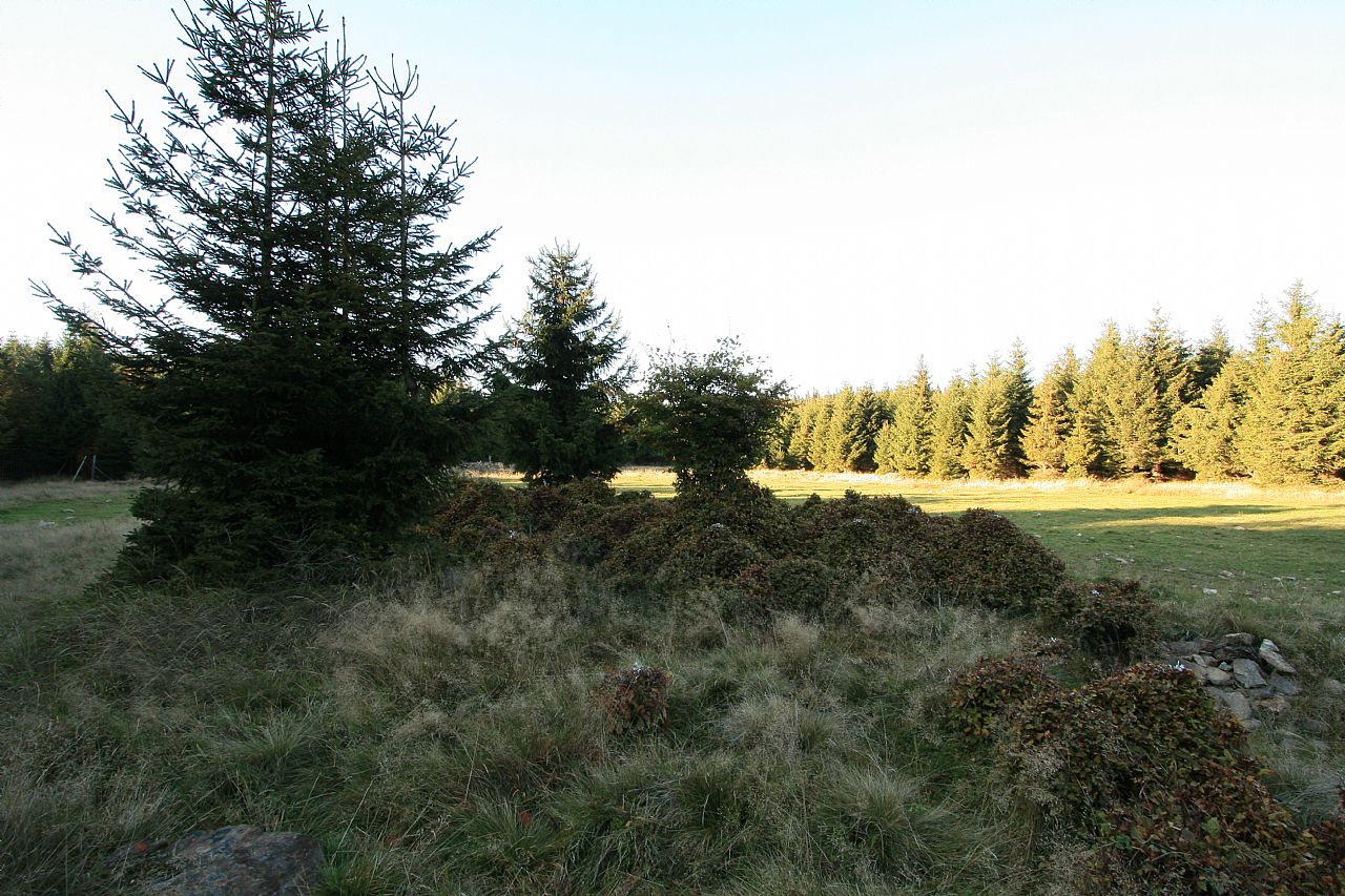 Pohled z Lyry (HLV 200; 1103 m) na Žárový vrch (HLV 195; 1101 m). Uprostřed mezi smrky je nový VV Žárový vrch - JZ vrchol (VV 195a; 1008 m).