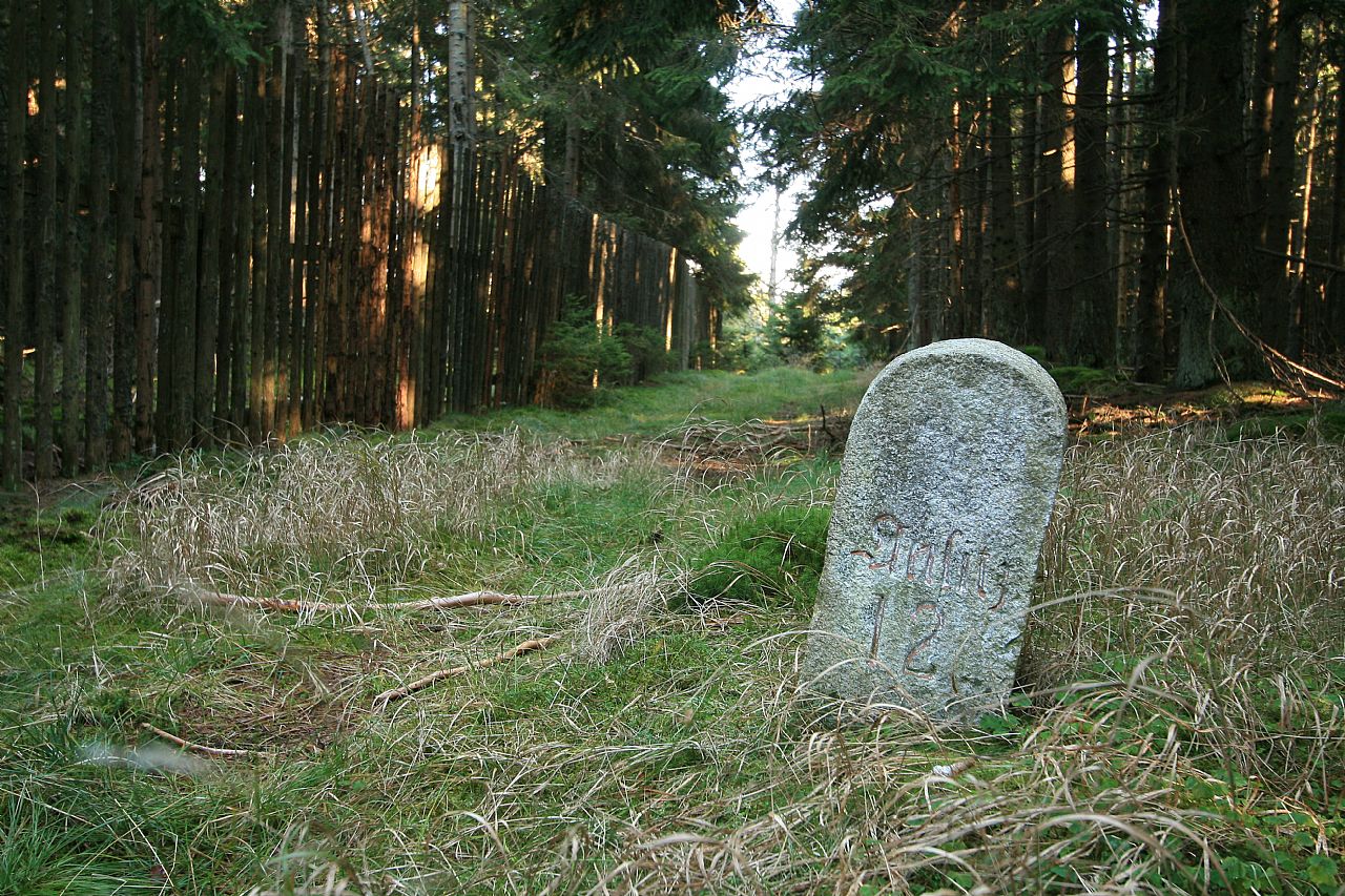 Kamenný patník na spočinku v blízkosti vrcholu Větřína (HLV 133; 1178 m).
