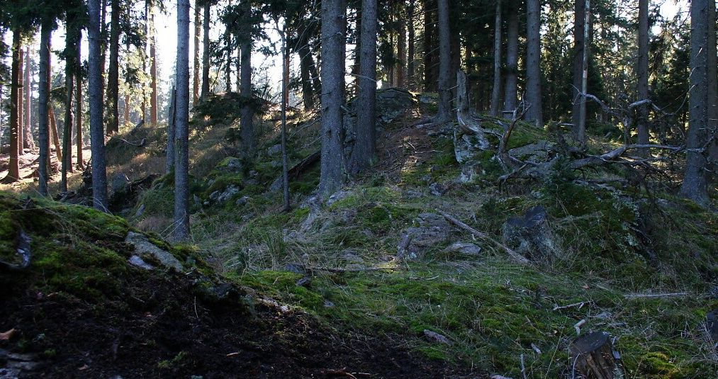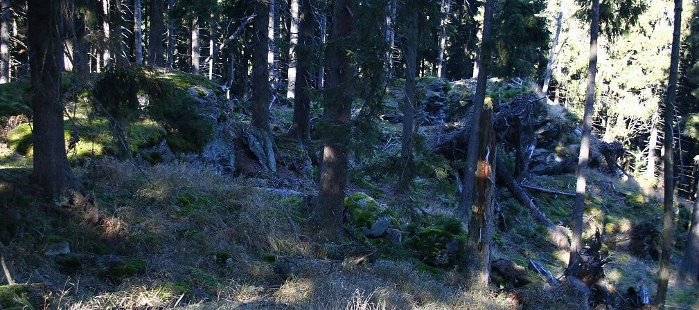 Na vrcholu Jeřábu (HLV 377; 1003 m). Skupina smrků v levé části je pravděpodobně nejvyšším místem.