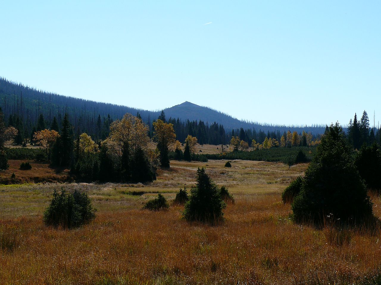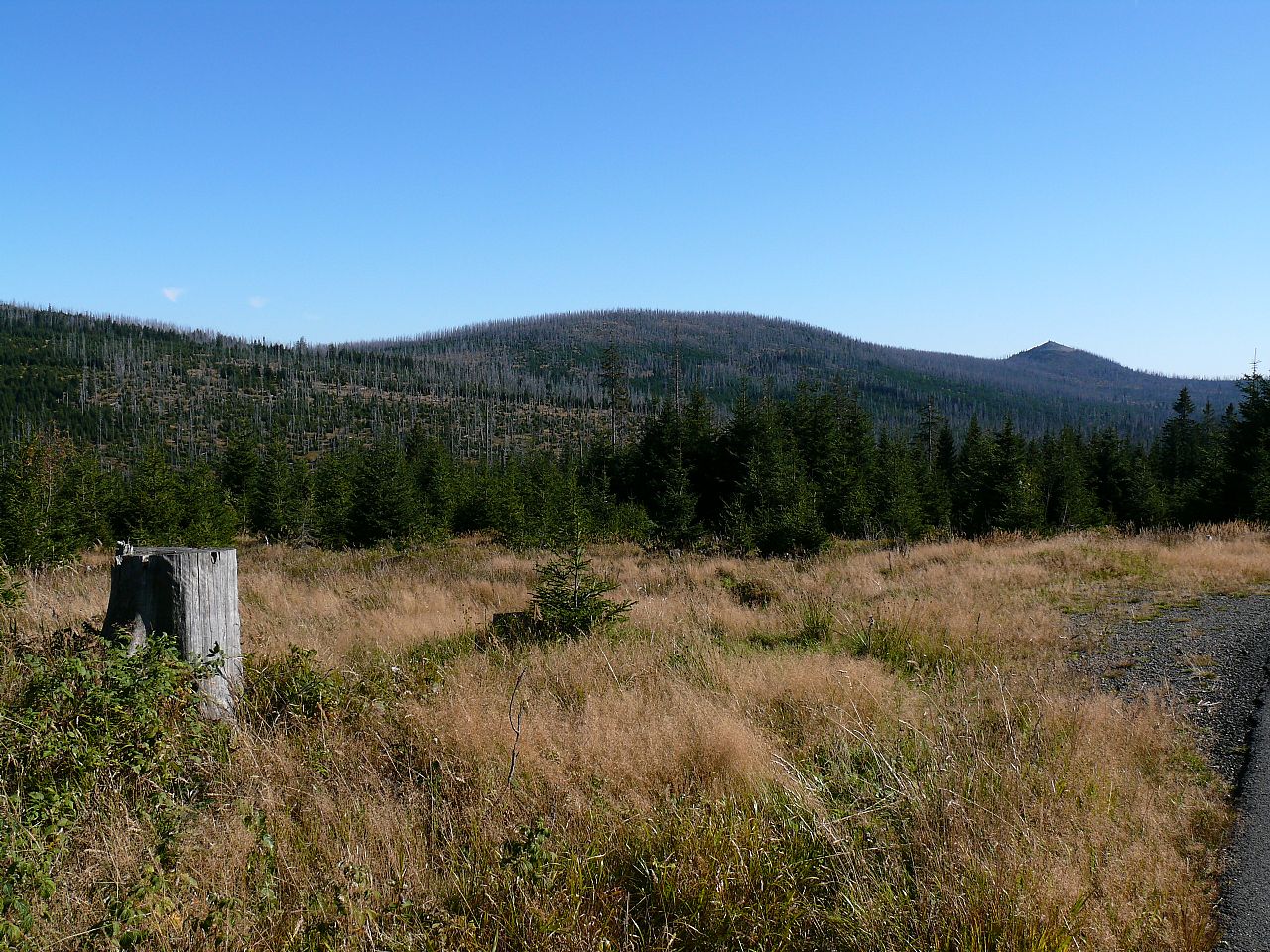 Pohled z vrcholu Knížecího stolce (HLV 94; 1236 m) k severovýchodu. Vpravo Lysá (HLV 96; 1228 m), na obzoru uprostřed Chlum (HLV 122; 1191 m).
