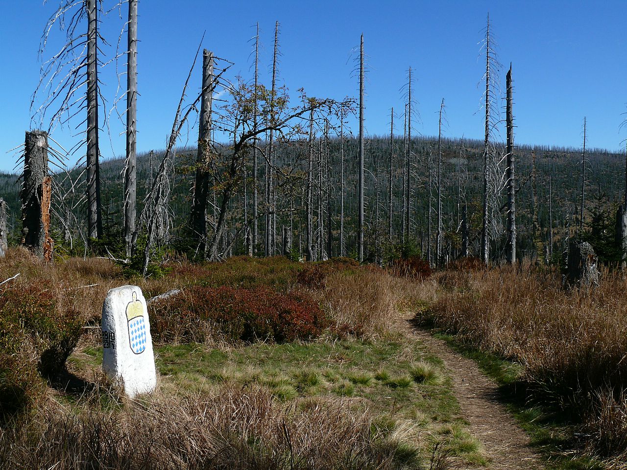 Velká Mokrůvka (HLV 25; 1370 m) s historickým hraničním s kamenem z úbočí Hraniční hory (Kleine Spitzberg / 1233m).