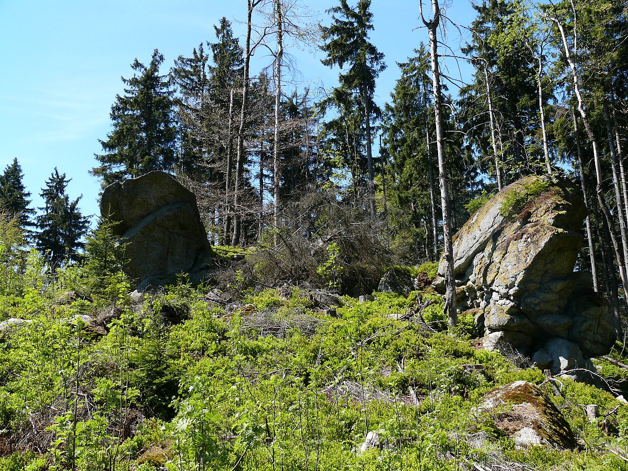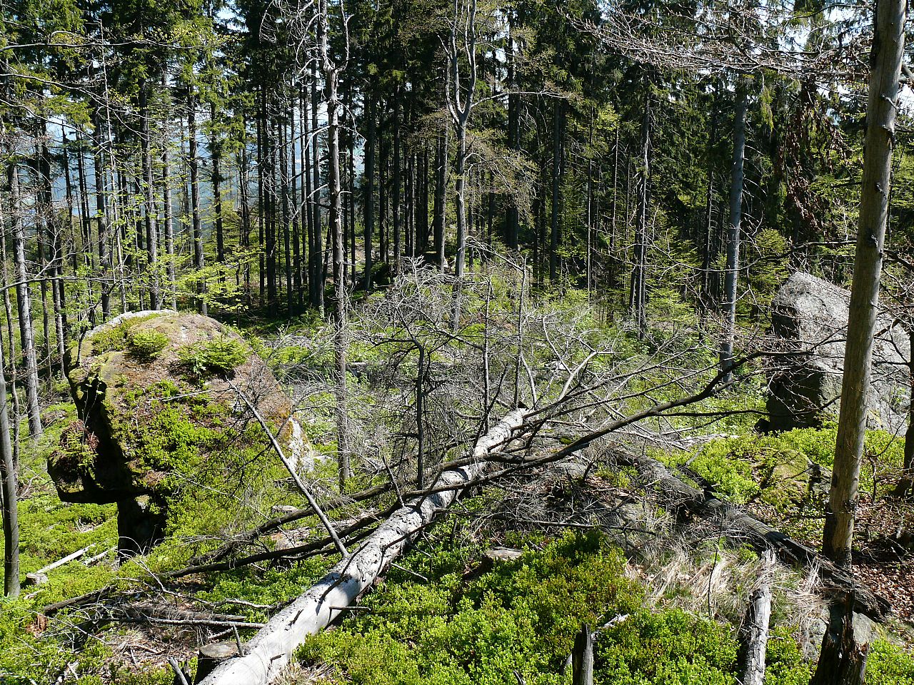 Pohled z nejvyššího balvanu na vrcholu tisícovky Velký Plešný (HLV 355; 1010 m).