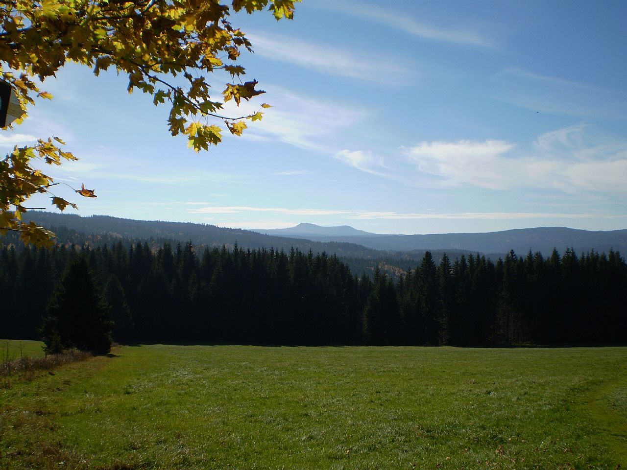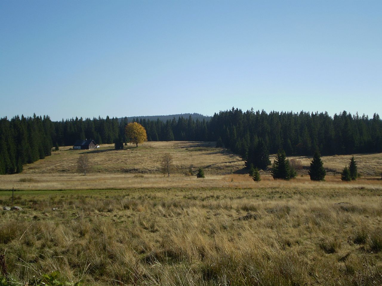 Louka na bývalé huťi Hluboká pod tisícovkou Huťská hora (HLV 126; 1187 m), přes kterou vede turistická trasa z Turnerovy chaty na Zhůří. V pozadí tisícovka Poledník (HLV 52; 1315 m).