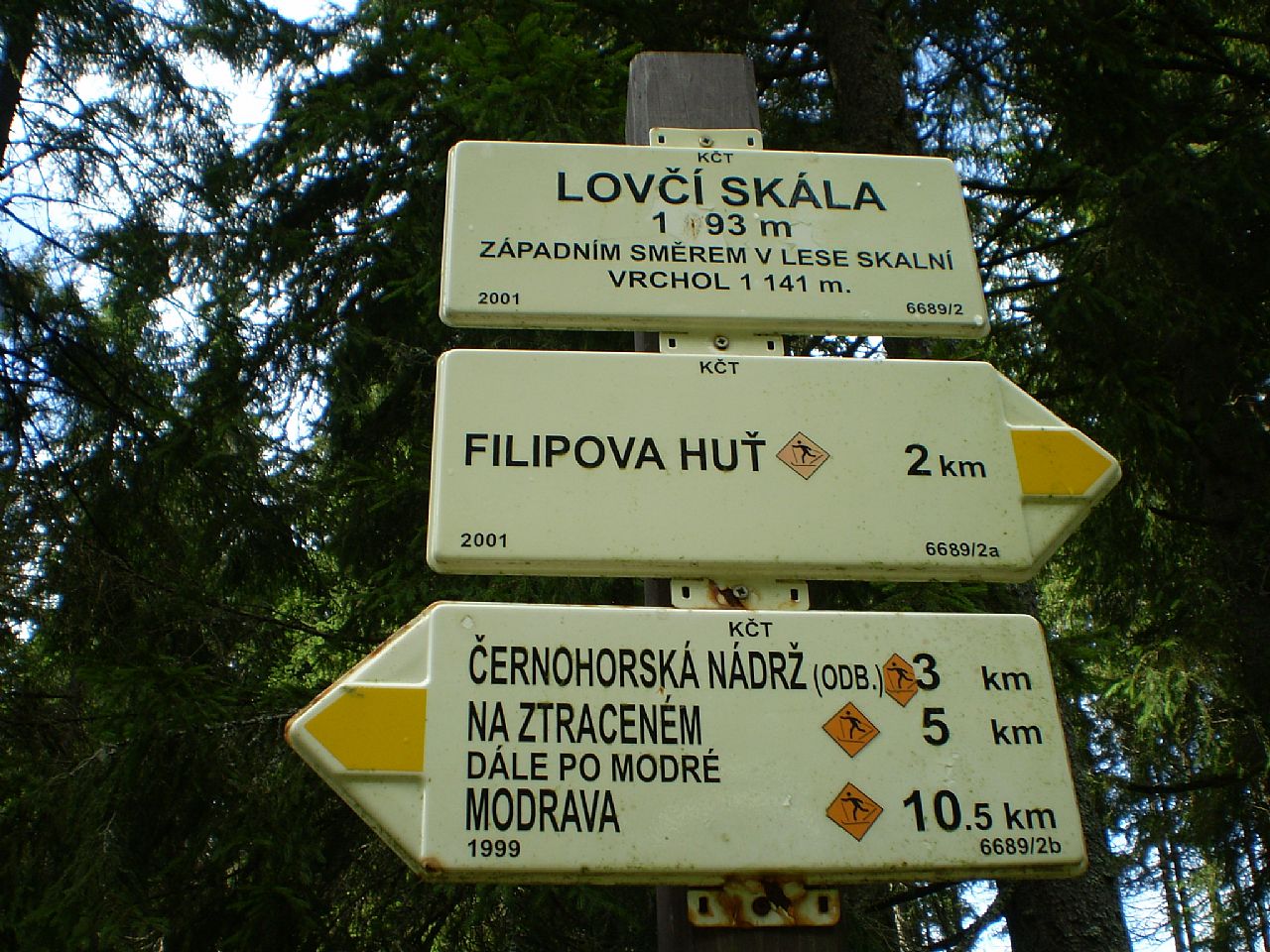 Turistické značení u odbočky na tisícovku Lovčí skála (VV 87a; 1165 m).
