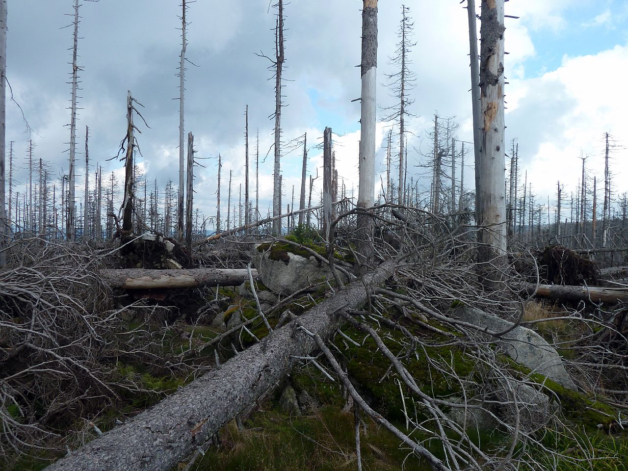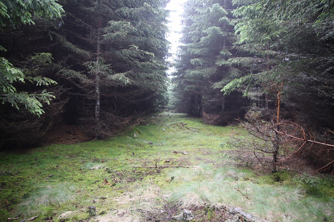 Vrchol Vysokého hřebenu (HLV 39; 1341 m) je v současné době jen těžko přístupný kvůli velkému množství polámaných stromů. Fotka je pořízena asi 10 metrů od geodetického bodu na vrcholu.