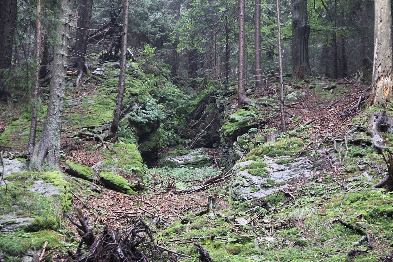 Divoká skalní rozsedlina v J okraji vrcholové plošiny Palečkovského vrchu (VV 29b; 1014 m).