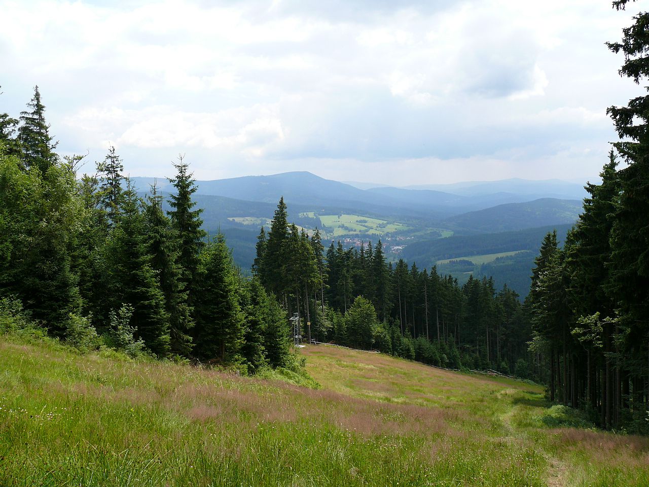 Sjezdovky na úbočí Špičáku (HLV 116; 1205 m). V pozadí Železná Ruda.