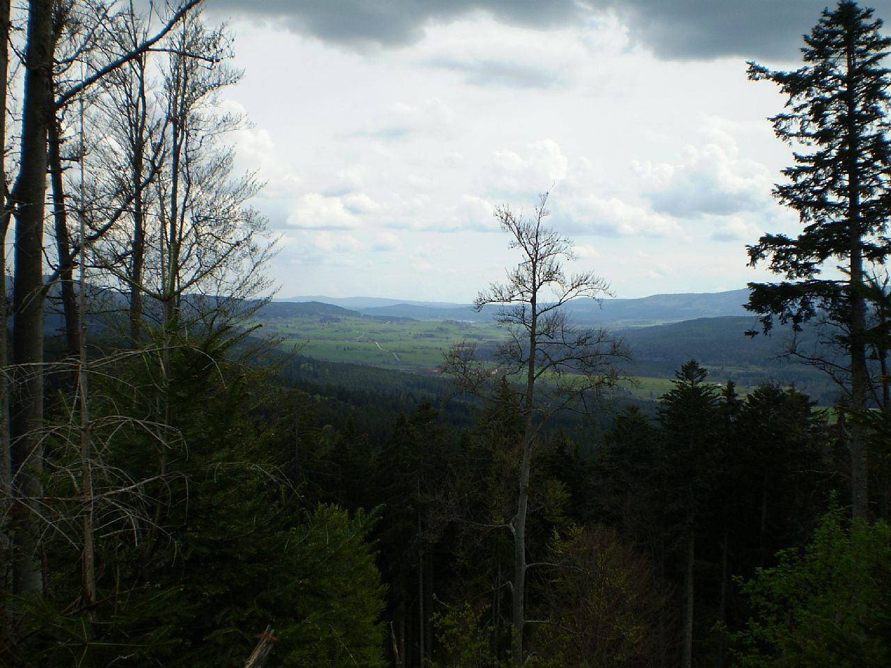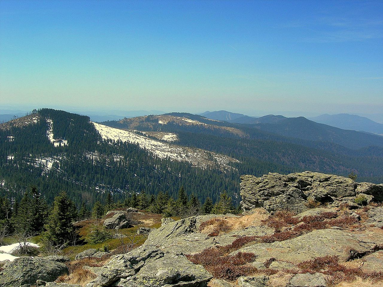 Šumavské lesy a vrcholy v Bavorsku směrem od Ostrého (HLV 70; 1291 m).
