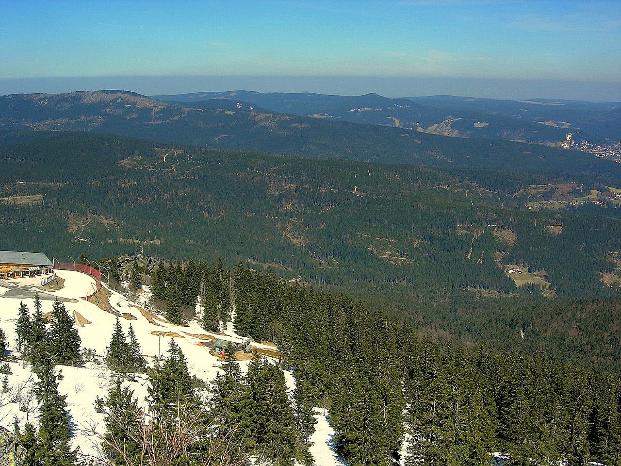 Průsek lyžařské sjezdovky spadající SV z vrcholu Perninského vrchu (HLV 393; 1000 m). Na obzoru vrchol Klínovce (HLV 86; 1244 m).