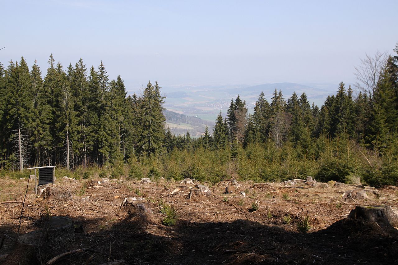 Zastavení Pohádkové stezky na jižním úbočí Kraví hory (HLV 228; 1071 m) je poblíž jejího vrcholu - pohled na severní část Pomezního hřebenu, jehož částí je Lysečinská hora (HLV 125; 1188 m).