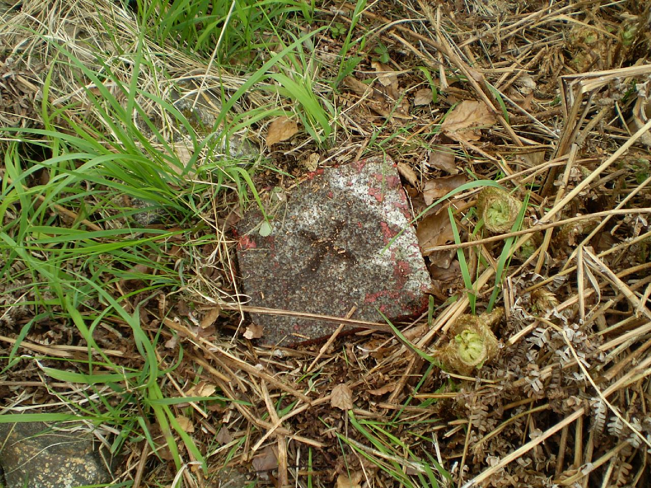 Detail zarostlého geodetického bodu na vrcholu tisícovky Mechový vrch (VV 207a; 1013 m).