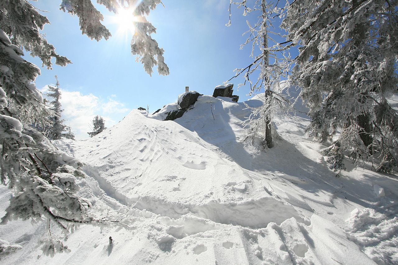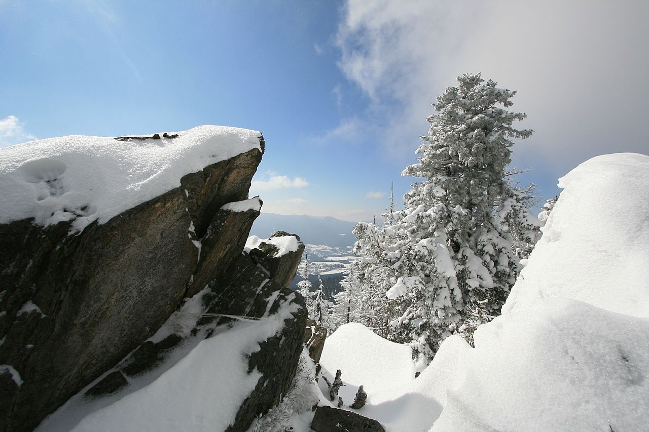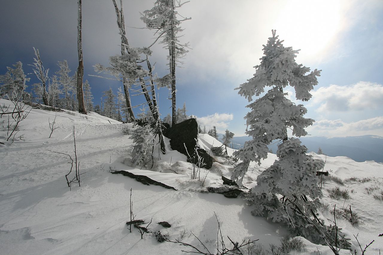 Vrcholová skála na temeni Jezerní hory - S vrcholu (HLV 199; 1093 m) od geodetického bodu.