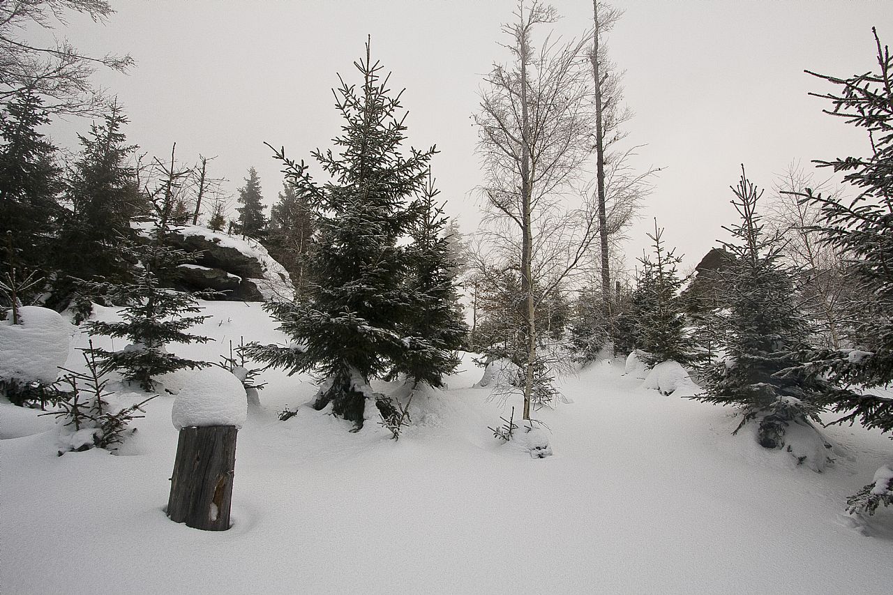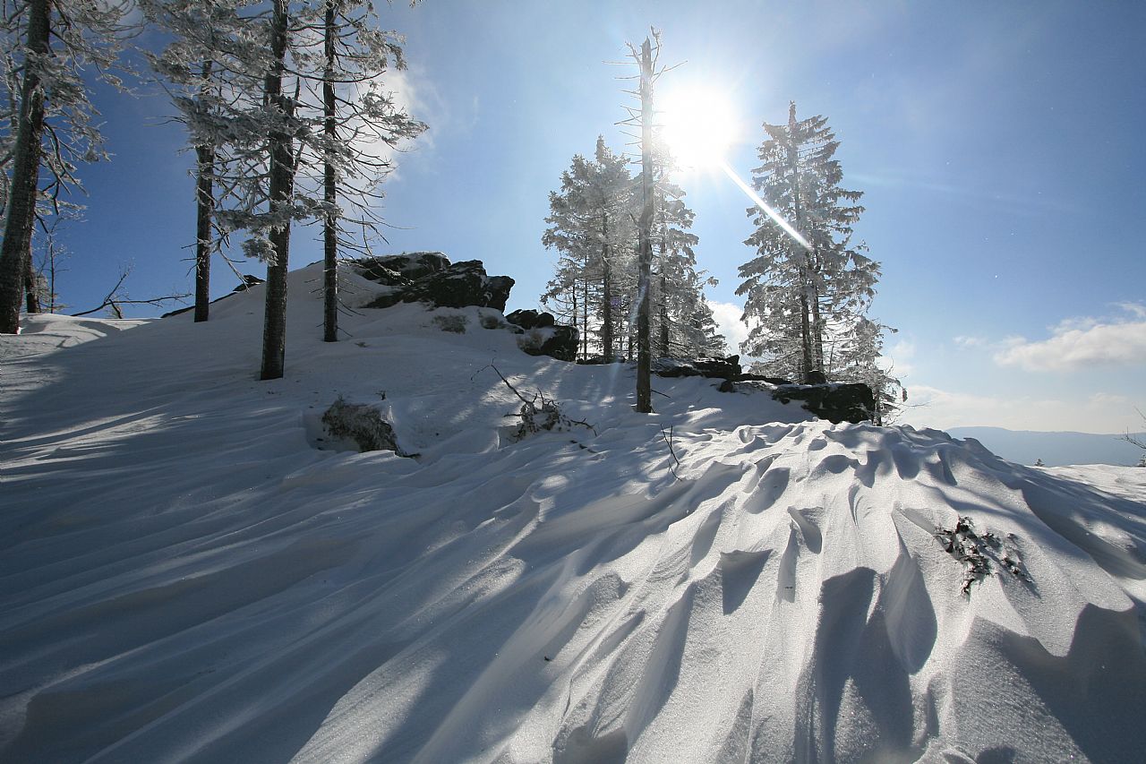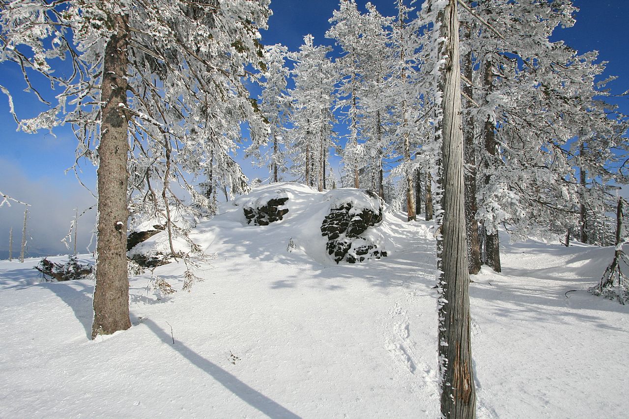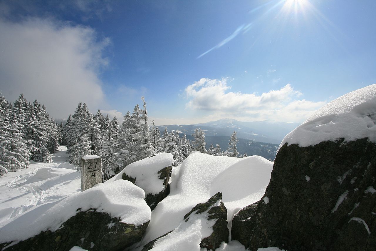 Vrcholová skála na temeni Jezerní hory - S vrcholu (HLV 199; 1093 m) od geodetického bodu.