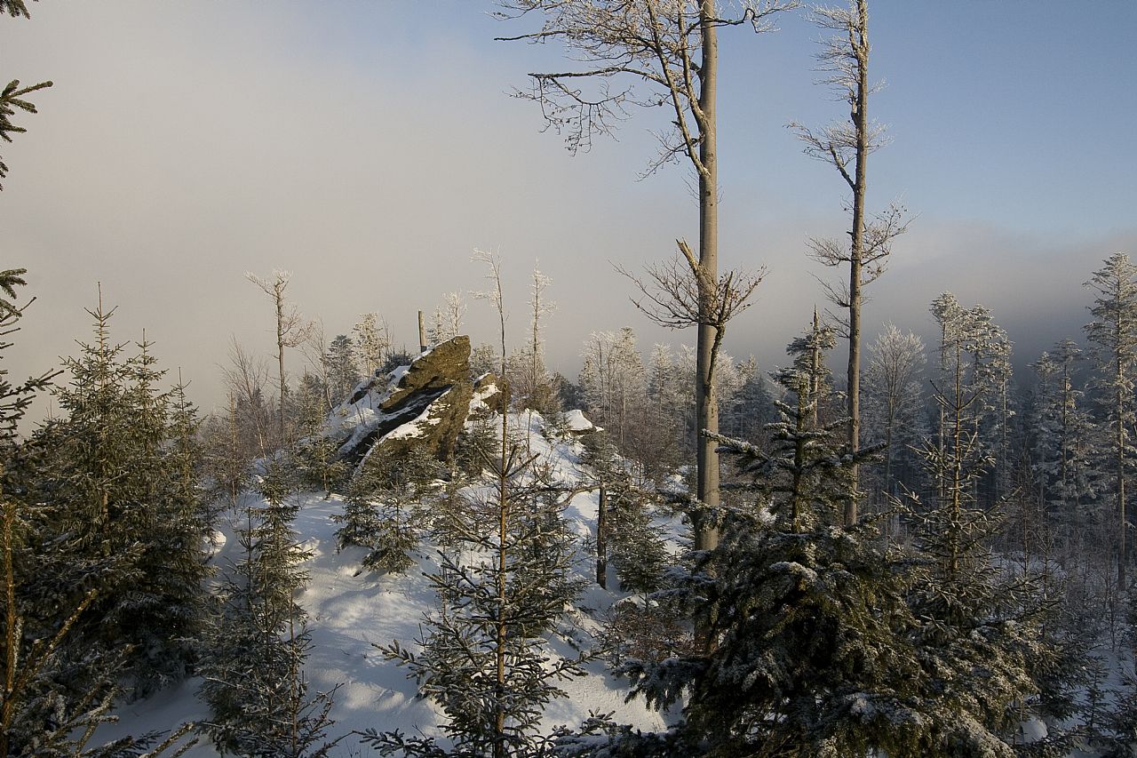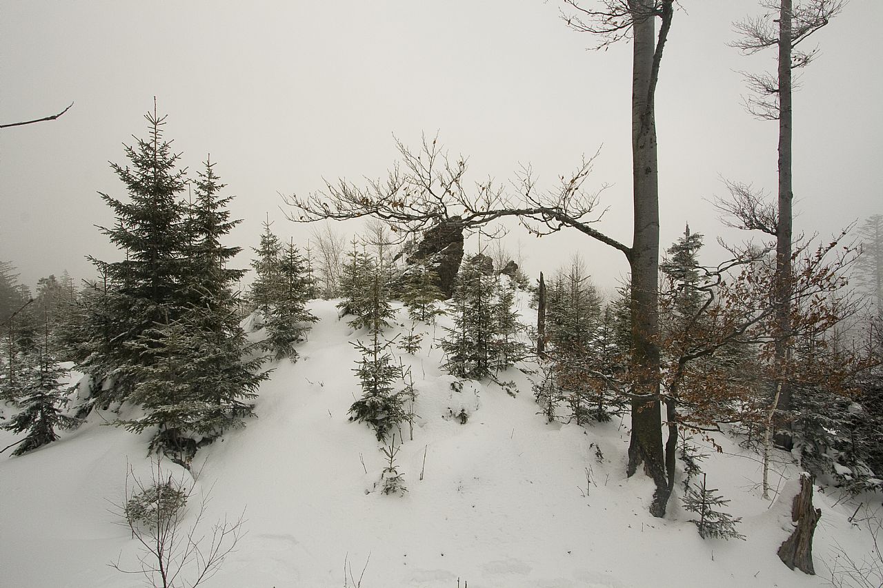 Východní vrcholová skála na temeni Jezerní hory - S vrcholu (HLV 199; 1093 m).