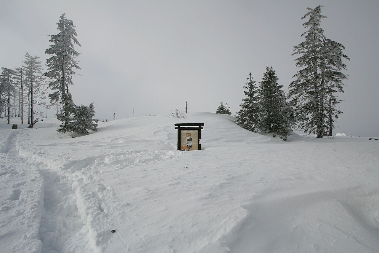 Informační tabule označuje místo, kde v blízkosti vrcholu Svarohu (HLV 42; 1333 m) stávala Juránkova chata.