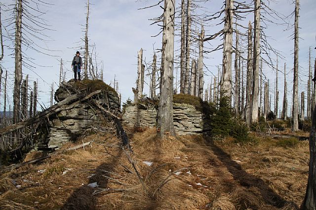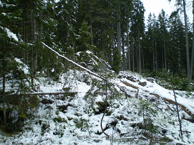 Vrcholová skalka na vrcholové plošině Ždánidel (HLV 54; 1308 m) je téměř ukrytá pod vyvrácenými smrky.