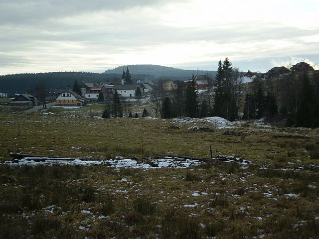 Obec Kvilda z parkoviště nedaleko tisícovky Lapka (HLV 136; 1171 m).