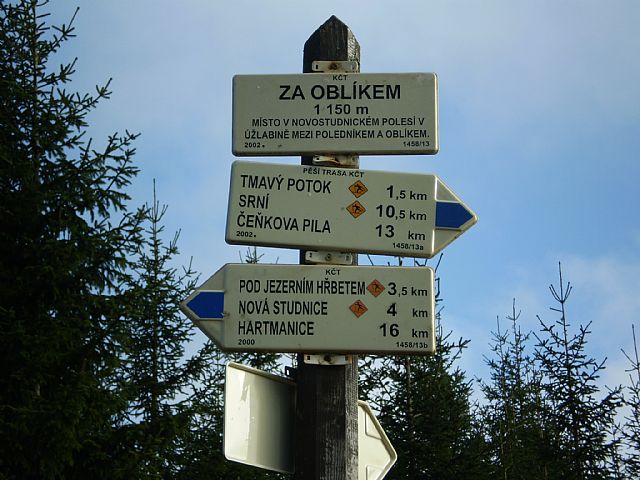 Turistické rozcestí "Tmavý potok" pod tisícovkou Oblík (HLV 100; 1227 m).
