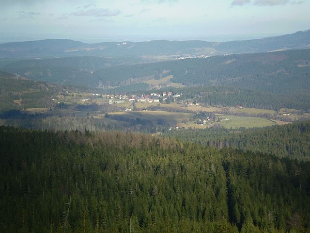 Pohled z vrcholu tisícovky Oblík (HLV 100; 1227 m) na sever. Uprostřed obec Srní, mírně vpravo za hřebenem částečně viditelná obec Kašperské hory. Vlevo nad obcí strážní hrad Kašperk.