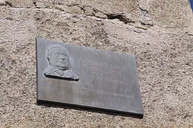 Pamětní deska, kterou odhalili Jihočeši v roce 1968 k 100. výročí úmrtí Adalberta Stiftera na sloupu jeho pomníku na svazích Plechého (HLV 21; 1378 m).