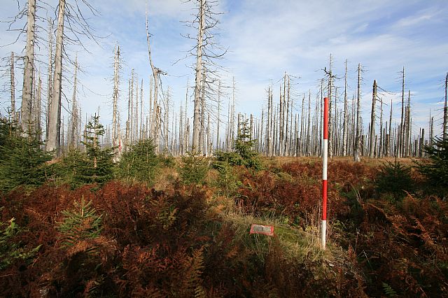 Současná značně odlesněná podoba okolí Stifterova pomníku na svahu Plechého (HLV 21; 1378 m).
