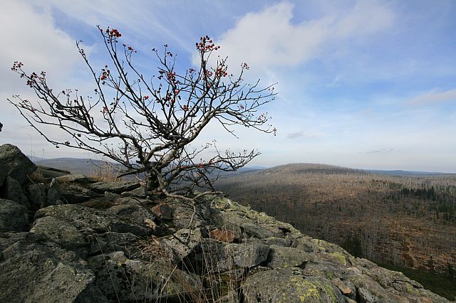 Skalka na severním okraji vrcholového hřbetu Velké Mokrůvky (HLV 25; 1370 m).