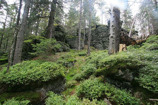 Vrcholová skála Tetřeva (HLV 77; 1260 m) od východu.