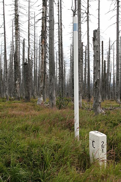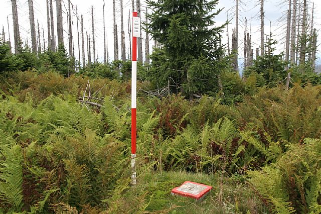 Čerstvě natřená tyč geodetického bodu na vrcholu Velké Mokrůvky (HLV 25; 1370 m) neleží přesně na bavorsko-české hranici, ale asi 20-30 m v Čechách.