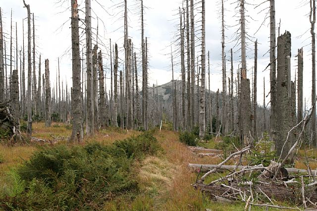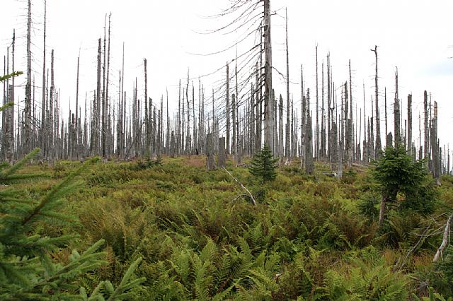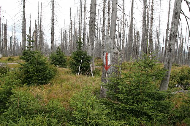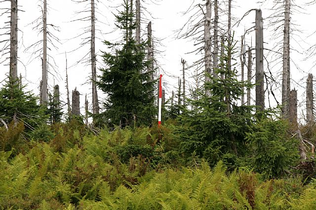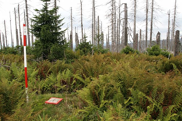 Na vrcholu Velké Mokrůvky (HLV 25; 1370 m). Pohled od geodetického bodu na S. Je patrná nová zeleň a zárodky mladého lesa mezi odumřelými smrky.