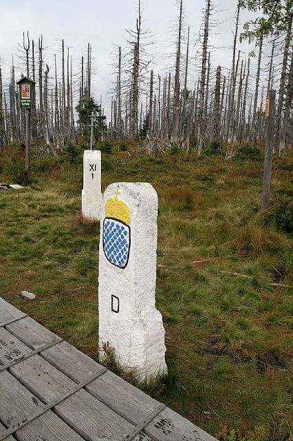 Bavorská plocha historického hraničního kamene z r. 1771 na Hraniční hoře, spočinku Špičníku (HLV 34; 1351 m). V pozadí Malá Mokrůvka (HLV 44; 1330 m) a Velká Mokrůvka (HLV 25; 1370 m).