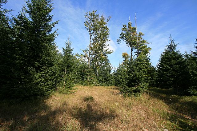 Rozlehlá vrcholová plošina Vlčího hřebene - J vrcholu (HLV 174; 1119 m) s geodetickým bodem.