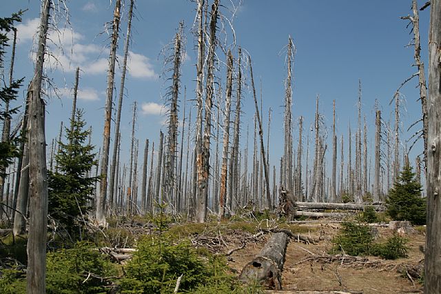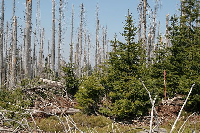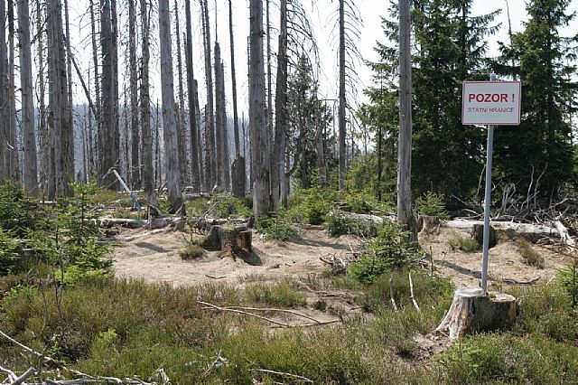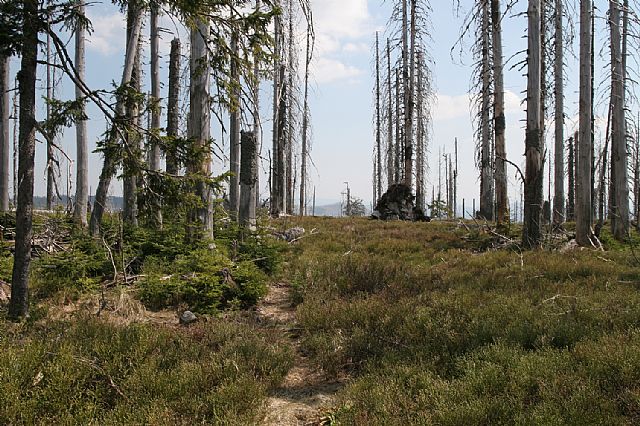 Vrchol Malé Mokrůvky (HLV 44; 1330 m) s vybělenými smrkovými kmeny, vpravo geodetický bod.