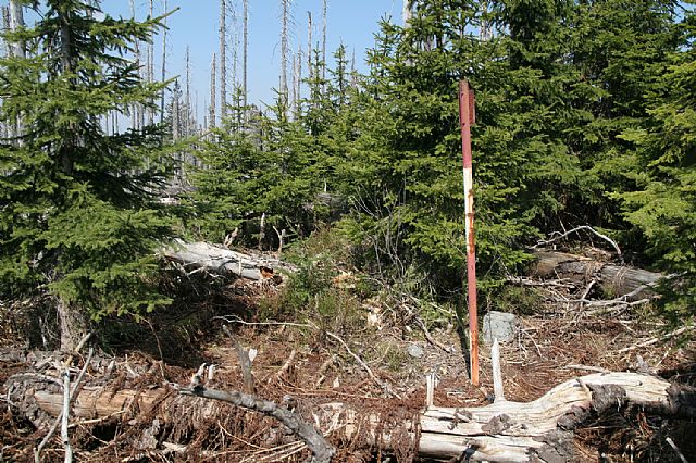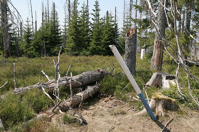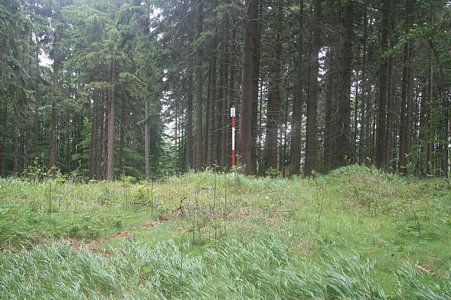 Hraniční česko-bavorský chodník na vrcholu Malé Mokrůvky (HLV 44; 1330 m).
