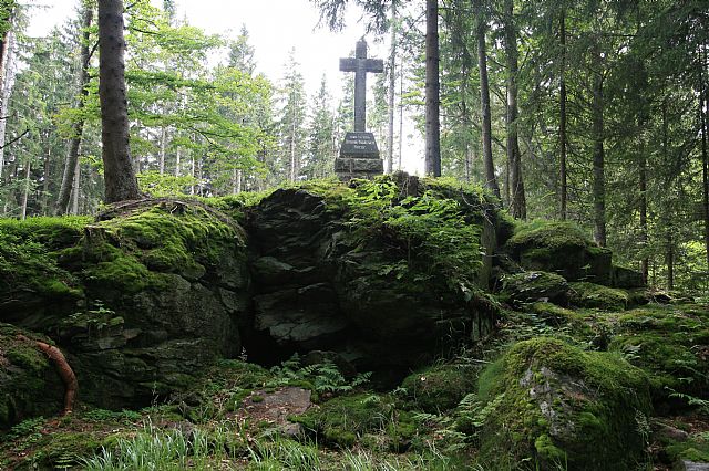 Vrcholová skalka s pamětním křížem na Obří hoře (VV 148b; 1114 m).