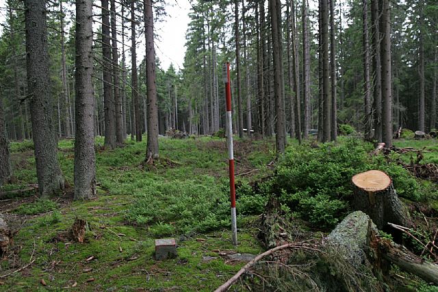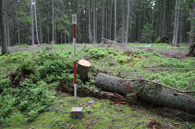 Geodetický bod a historický patník na skalnatém spočinku v blízkosti vrcholu Větřína (HLV 133; 1178 m).
