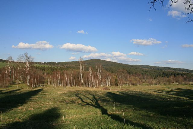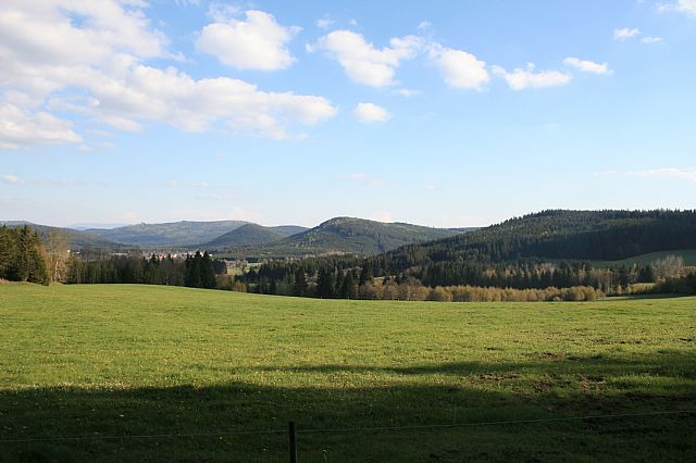 Pohled z východního úbočí Janské hory (VV 102d; 1112 m) k JV. Na obzoru zleva tisícovky: Zahrádky (HLV 349; 1011 m), hřbet Poleckého vrchu (HLV 172; 1120 m), Homole (HLV 276; 1044 m), Vyhlídka (HLV 233; 1068 m), Kamenáč (HLV 266; 1048 m).