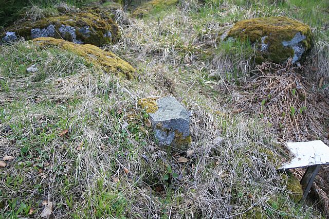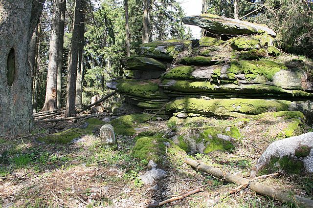 Historický patník u vrcholové skalky na Dlouhém hřbetu - V vrcholu (VV 94b; 1081 m).