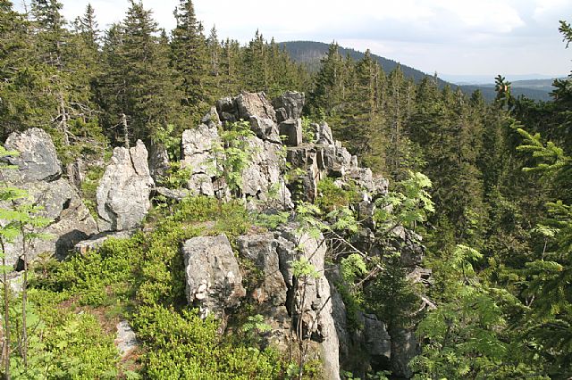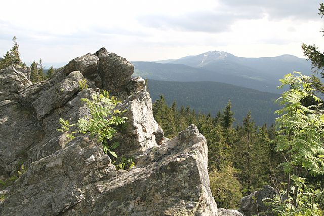 Teleobjektivem sňatý detail vrcholové skály Ostrého - S vrcholu (VV 70a; 1179 m) z vrcholu Ostrého (HLV 70; 1291 m).