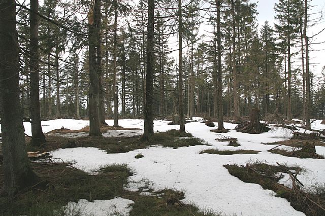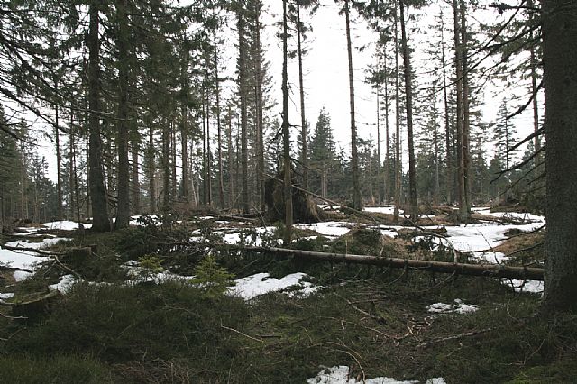 Vrcholová plošina Můstku (HLV 91; 1234 m) po orkánu Kyrill a polomech začátku roku 2008 v nepřívětivém předjaří.