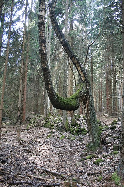 V lese ukrytá ostrá pyramidová vrcholová skalka tisícovky Můstek - Z vrchol I (HLV 381; 1002 m).