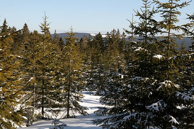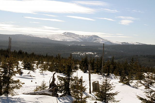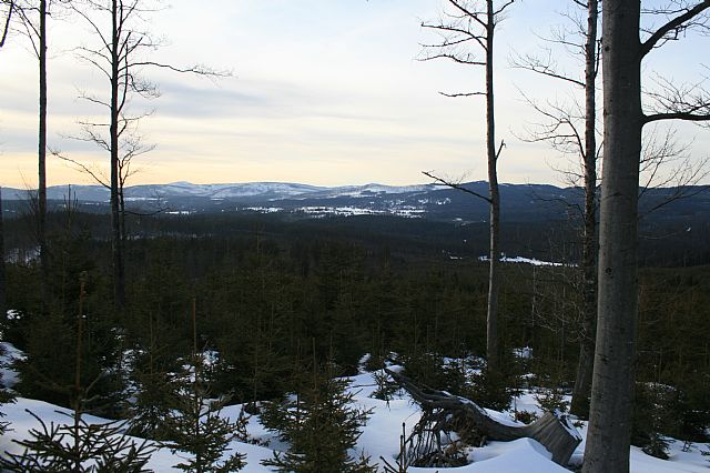 Pohled z vrcholu Knížecího stolce (HLV 94; 1236 m) jižním směrem. Na obzoru masiv Špičáku (HLV 103; 1221 m) a tisícovky Nad Hospodárnicí (HLV 129; 1182 m).