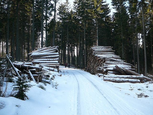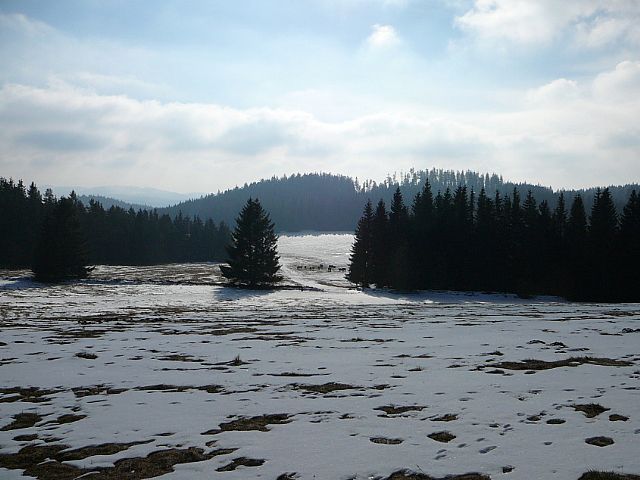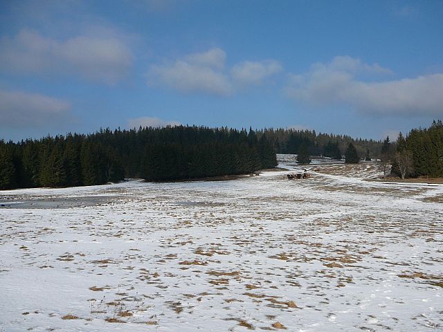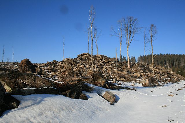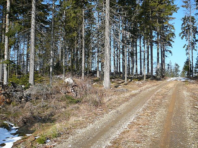 ...ale jen o několik metrů dále na jižní straně vrcholu Větrného (HLV 259; 1051 m) je tatáž cesta již zcela bez sněhu.