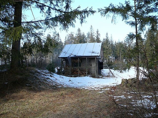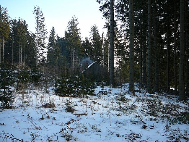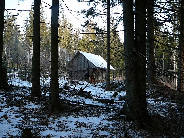 Pastevecká chata na JV úbočí Větrného (HLV 259; 1051 m) je i v tuto roční dobu zabydlená.