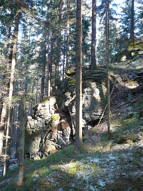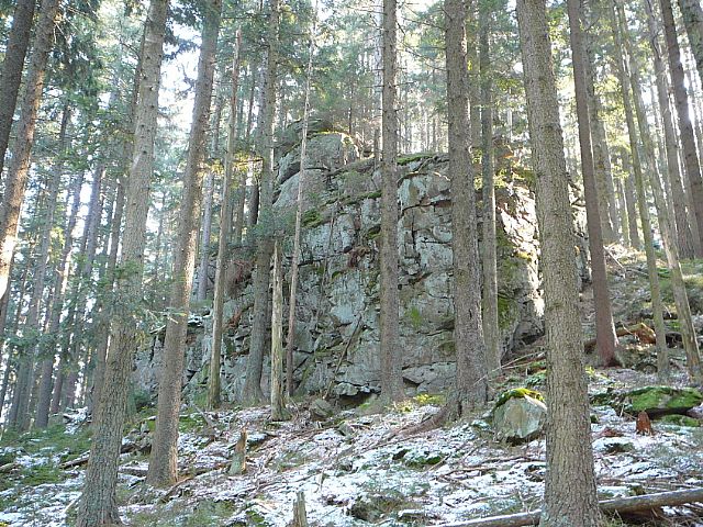 Od SZ ční k vrcholu tisícovky Na skále (HLV 351; 1011 m) mohutná skalní stěna.