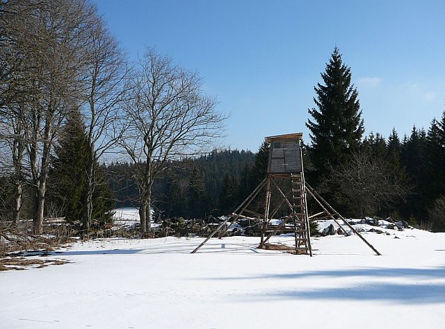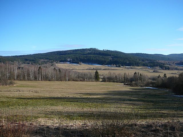 Pohled z okraje lesa od zřejmě nejvyššího bodu Doupné hory (VV 258a; 1029 m) na sousedící rozlehlou pláň s druhým, téměř tožně vysokým nejvyšším místem.