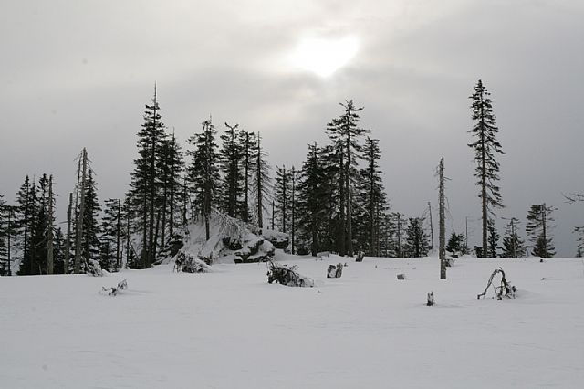 Průhled okénkem lesáckého posedu stojícího v sedle mezi Malou Deštnou (HLV 203; 1090 m) a Velkou Deštnou (HLV 179; 1116 m) na Velkou Deštnou.