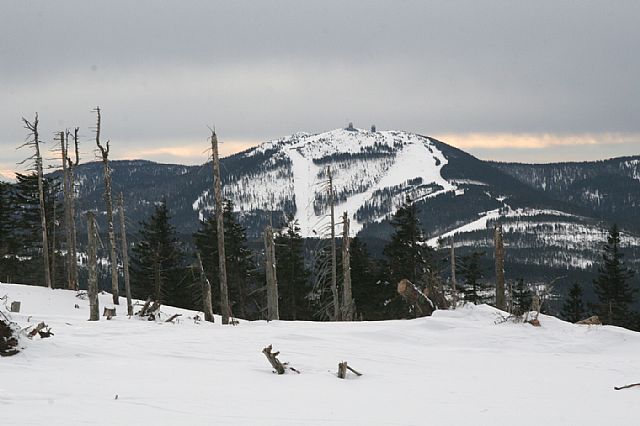 Grosser Arber (1457 m) a Kleiner Arber (1399 m) z horní části jižního svahu Jezerní hory (HLV 37; 1343 m).